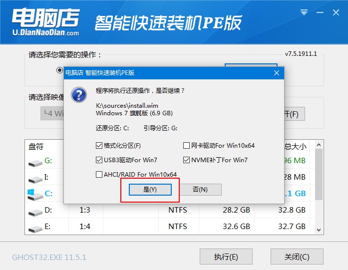 5、进入电脑店winpe桌面,打开电脑店一键装机,如图所示,选择之前已下载的镜像系统,并安装在C盘,点击“执行”进入下一步