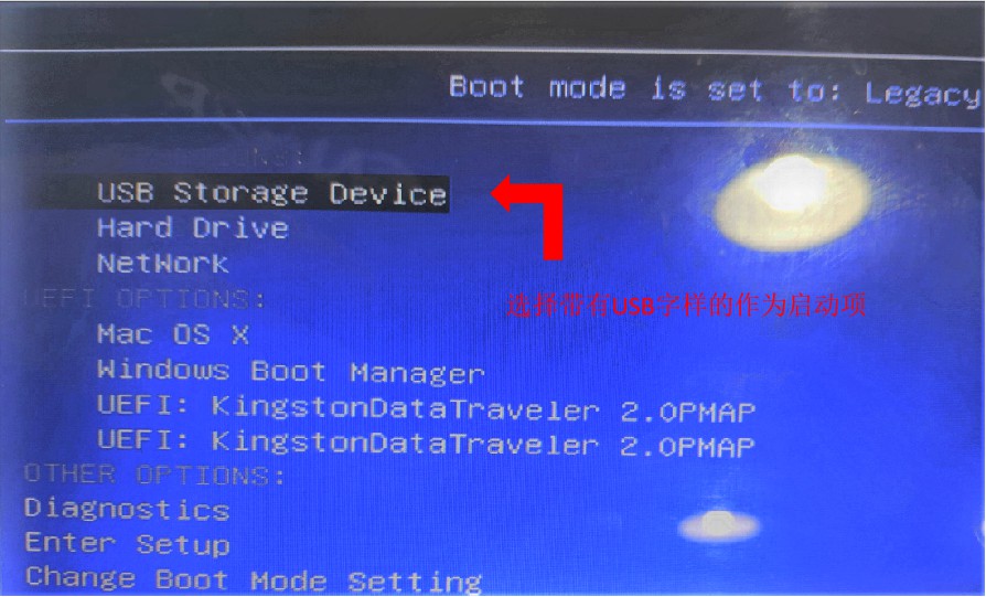 2、按F12就可以进入boot options启动选项,直接选择U盘启动盘就行了。
