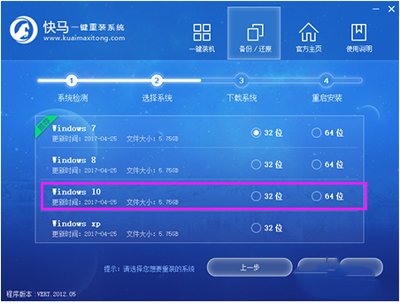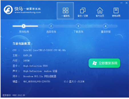 系统检测:首先我们在网页下载资源包之后打开快马一键备份还原系统,然后在系统检测的选项中我们就可以看到“立即重装系统”的命令,然后点击它进入系统重装。