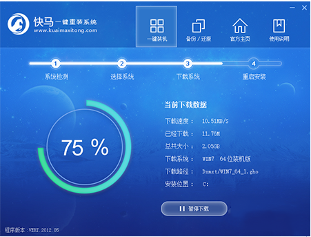 - 安装系统:进入了系统镜像下载窗口,这时候大家只需要等待下载完成就可以了,系统下载完成后会自动安装系统的,快马一键重装系统支持断点下载,也可以暂停下载!